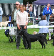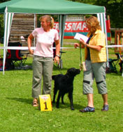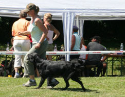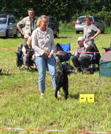 3 years, black bitch, feminine head and expression, good profile, correct bite an eye colour, well sit on ears, good neck and topline, correct tailset, enough body for her age, a little bit long in line, moves with drive, well angulated front and rear, good coat, well handelt. excellent |
