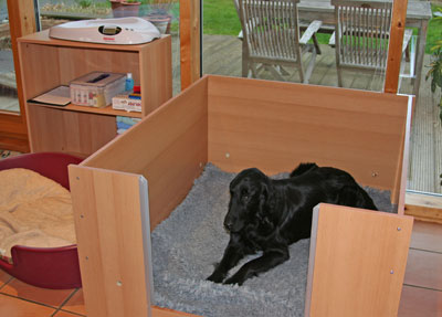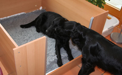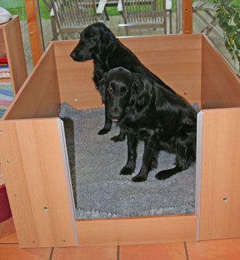 19. und 21.03.2007: Kira am 55. und 57. Trächtigkeitstag. Nun dauert es nicht mehr lange. Die Wurfkiste wird von Kira und Caitlin ausgiebig getestet.