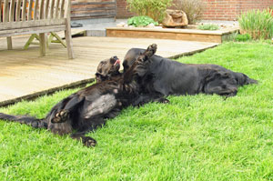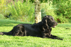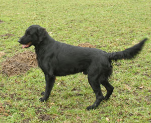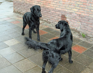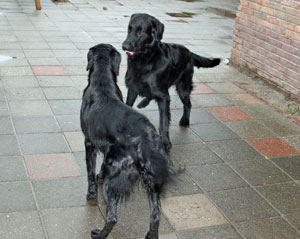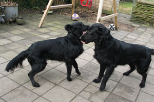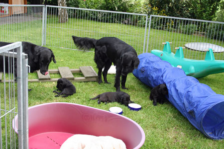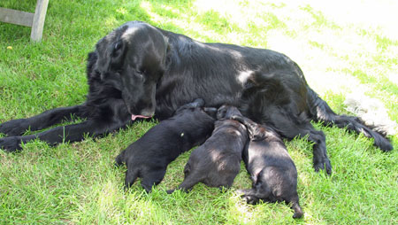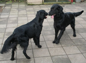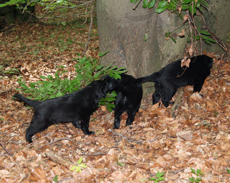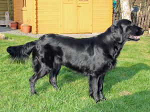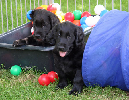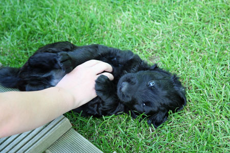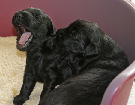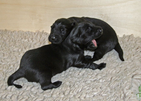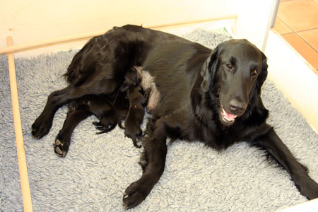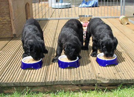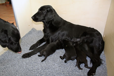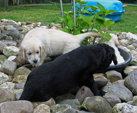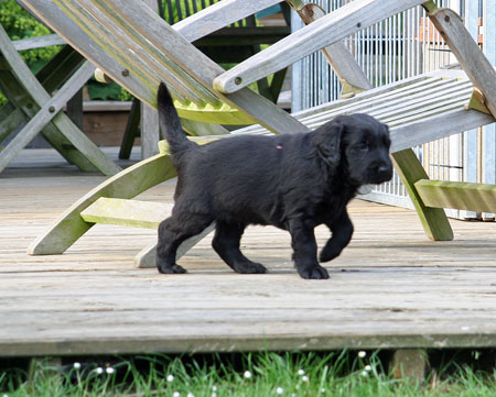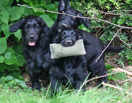 5 1/2 Wochen ist unser Trio nun schon auf der Welt. Die Zeit vergeht uns entschieden zu schnell... Spielen, raufen, toben, rennen, fressen, schlafen, schmusen. Die wesentlichen Bestandteile im Tagesablauf unserer Welpen. Im Garten fühlen sie sich nach wie vor am wohlsten. Beliebtester Schalfplatz ist mittlerweile ihre kleine Hundehütte. Scheint die Sonne, liegen sie auch gerne im Schatten des großen "Krokodils". Sie bekommen jetzt von uns 4 Mahlzeiten. Am beliebtesten ist Welpenmilch mit Banane und Frischfleisch. Das Welpenfutter kommt noch nicht so gut an, da muss der Hunger schon richtig groß sein. Caitlin steht ihnen nach wie vor immer mal wieder für einen kleinen Nachtisch zur Verfügung. Ausflüge im Garten und im Haus werden von allen Dreien begeistert angenommen. Alles Neue wird gleich interessiert ausgekundschaftet. Im Gallopp den Hang hinunter endete meist im runterkugeln. Doch das machte erst richtig Spaß! Die zweite Wurmkur haben alle Drei wieder ohne Probleme überstanden. Gestern hat sich ein weiteres Flat-Familienmitglied zu uns gesellt. Kira's Bruder Mephisto wird ein paar Tage bei uns verbringen. Die Kleinen fanden den neuen Spielkameraden gleich richtig spannend. Er hält sich die Bande aber lieber noch ein wenig auf Distanz. Bald geht es los mit Autoausflügen und ein Treffen mit den 9 Nightingales Fellow's J'chen (3 Tage jünger) ist auch geplant. Dieses scharz-goldene Treffen wird bestimmt viele schöne Fotomotive liefern und ganz neue "Farbeindrücke" für die Kleinen. Die aktuellen Gewichte von heute: Calle 4320 g, Caspar 4120 g und Cassio 4320 g. |