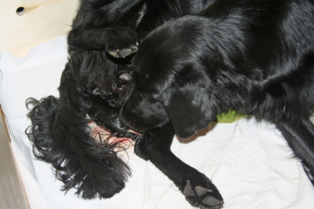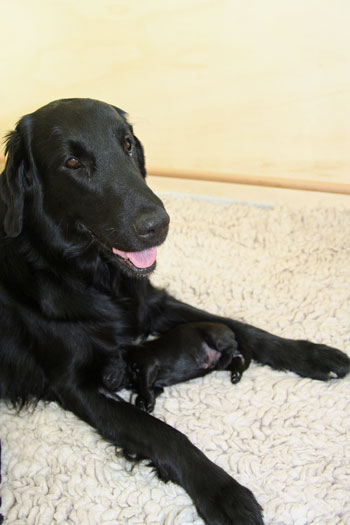 Der 58. Trächtigkeitstag. Nur noch wenige Tage und es ist endlich soweit. Unsere Vorbereitungen sind fast abgeschlossen. Caitlin ist immer noch gut drauf und lässt sich nicht wirklich anmerken, dass sie hoch tragend ist. Lediglich ihr Schlafbedürfnis ist ein wenig ausgepägter und der Spaziergang heute in der warmen Sonne schien sie doch ein wenig mehr anzustrengen. Die Welpenbewegungen sind seit einigen Tagen gut fühlbar und auch sichtbar wenn sie entspannt auf der Seite liegt. Heute musste sie nocheinmal mehr oder wenig widerwillig das Trimmen über sich ergehen lassen. Doch ihre zugewachsenen Pfoten und Ohren ließen uns keine Wahl. Wenn die Welpen erst mal da sind, bleibt für diese Art der Schönheitspflege sowieso keine Zeit mehr. |