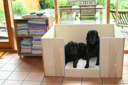 Der 52. Trächtigkeitstag. So langsam beginnt der Endspurt, aber Caitlin lässt sich davon noch rein gar nichts anmerken. Sie rennt nach wie vor im fliegenden Gallopp über die Felder und zeigt beim Toben keine nennenswerten Ermüdungserscheinungen. Mittlerweile sieht sie schon ein wenig trächtig aus. Ihre schmale Taille ist nun verschwunden. Aber aus der Entfernung sieht sie immer noch schlank aus. Ihr Appetit scheint weiter zuzunehmen als gelte es eine ganze Kompanie in ihrem Bauch satt zu bekommen. Bei uns beginnen nun die letzten Vorbereitungen. Die Wurfkiste muss saniert werden, Waage ausleihen, Handtücher sammeln usw. |