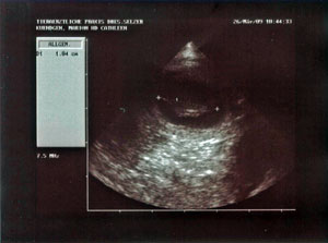 Endlich!!! Heute war ich mit Caitlin zum Ultraschall. Das lange Warten hatte endlich ein Ende. Unsere Freude war groß, als wir gleich Fruchtblasen und schlagende Herzen sehen konnten. Eine erste Zählung ergab mind. 6 Welpen, so dass wir von einer normalen Wurfstärke ausgehen können. Darüber freuen wir uns sehr, besonders nach den sehr großen Würfen von Kira, vor allem da Caitlin deutlich kleiner und zierlicher als Kira ist. Nun können wir endlich mit den Vorbereitungen für den bevorstehenden Wurf starten. Erfahrungsgemäß läuft jetzt die Zeit um einiges schneller... |